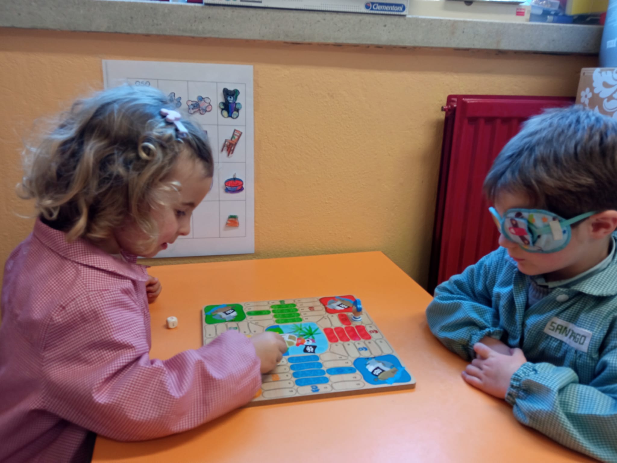 Pero además de llevar a cabo actividades relacionadas con el proyecto, en el aula de 3 años continuamos introduciendo juegos de mesa, los cuales nos encantan. Esta semana, además de jugar al dominó y al mémory, nos hemos iniciado en el parchís: